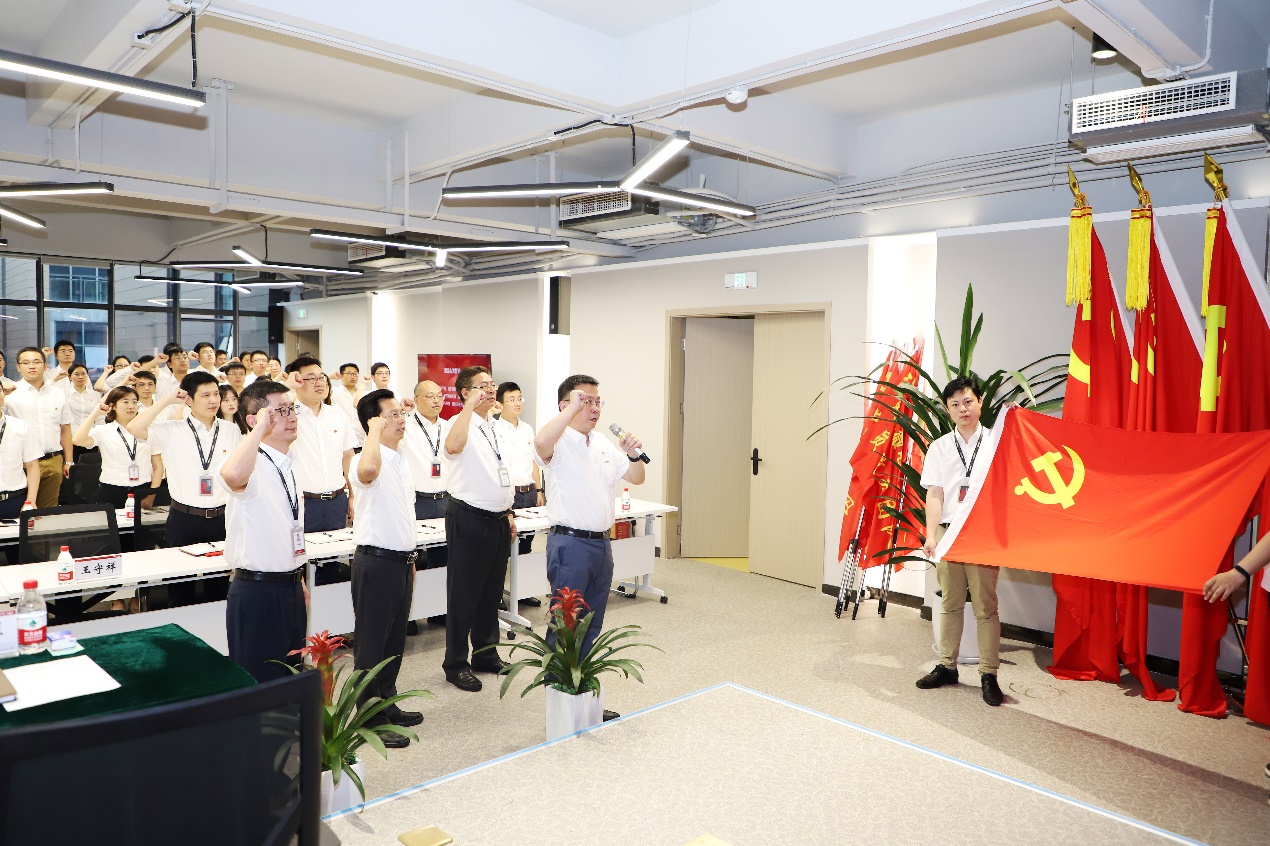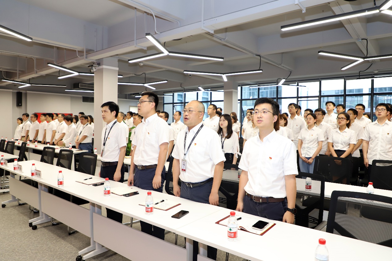 在王颖的带领下,全体党员精神抖擞、整齐列队、高擎右拳、一起面向鲜红的党旗重温入党誓词,用铮铮誓言见证初心、砥砺前行。