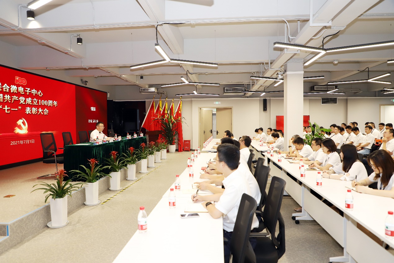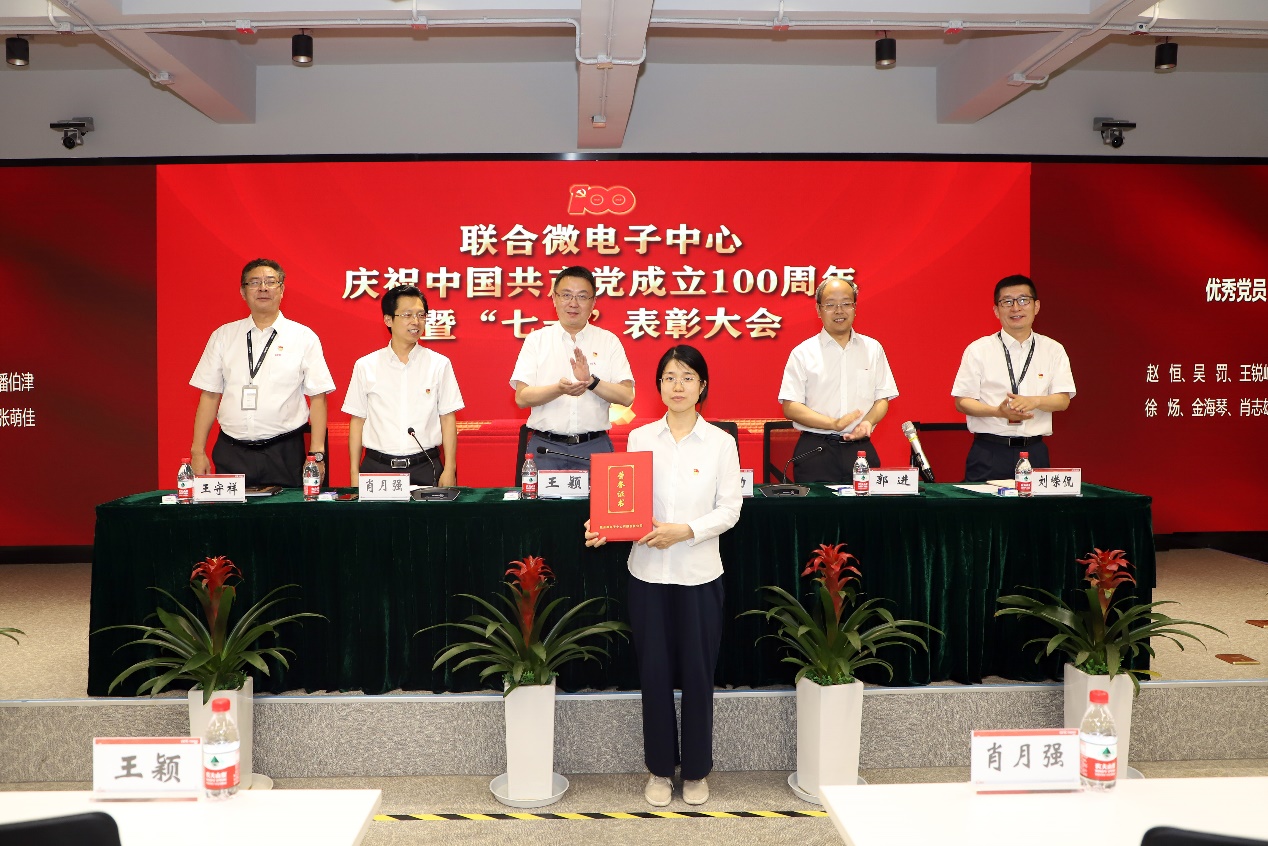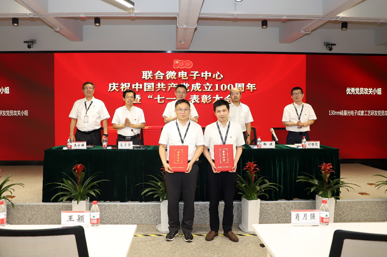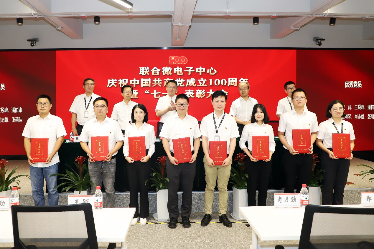 会上,王颖带领全体党员干部面向党旗重温入党誓词,并做专题报告;郭进宣读了《中共联合微电子中心有限责任公司委员会 2020-2021年度“七一”表彰决定》,领导班子成员为获得表彰的优秀共产党员、优秀党务工作者、优秀党员攻关团队和集团公司“两优一先”获得者颁奖,并对7个党员攻关团队进行了授旗。