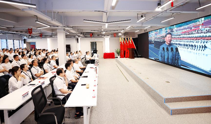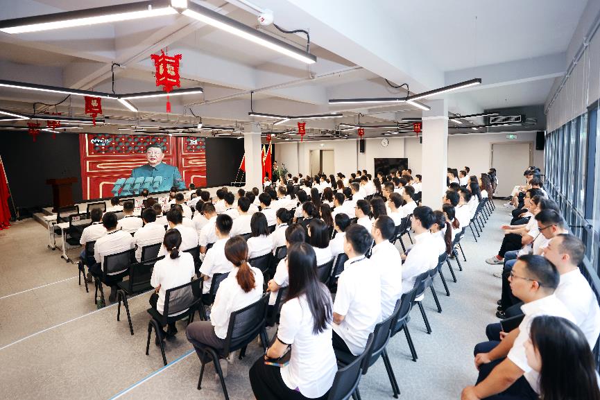 庄严巍峨的天安门城楼前,旌旗飘扬、举世瞩目。当屏幕上出现国旗护卫队铿锵有力的步伐、鲜艳的五星红旗冉冉升起的画面时,全体党员职工自发肃立,齐声高唱国歌,表达对伟大祖国的无限热爱和崇高敬意。习近平总书记发表的重要讲话鼓舞人心、催人奋进,检阅方阵英姿飒爽、斗志昂扬,新型武器装备惊艳亮相、威武雄壮,充分展现了在党的坚强领导下祖国发展取得的辉煌成就,彰显了新时代中国维